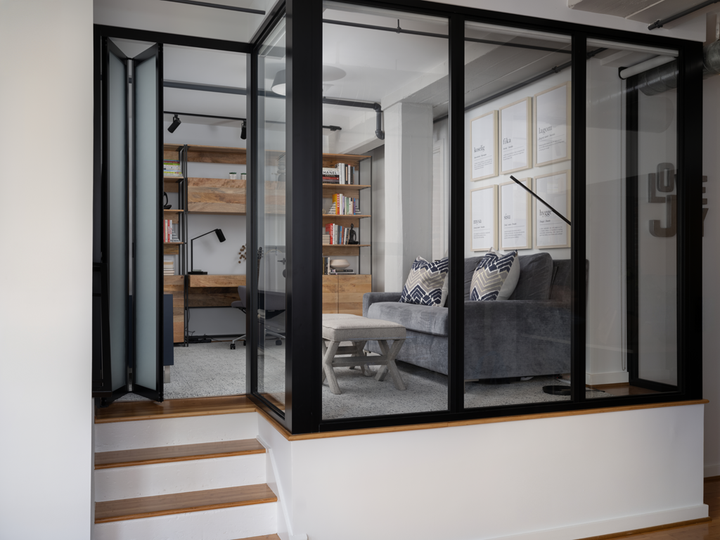 We converted the raised “flex space” into a multi-functional room that now serves as an office, a gaming/TV space and a guest bedroom. Sleek glass walls were added to block sound and motorized shades were added for additional privacy, when needed.