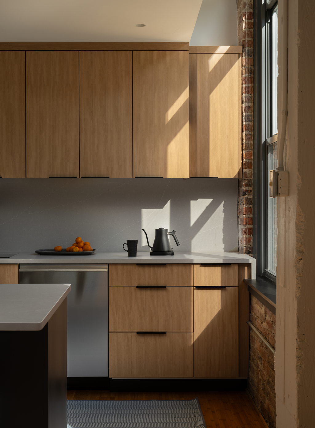 We wrapped the quartz counter into the window ledge for a more blended look and kept the exposed brick for texture.